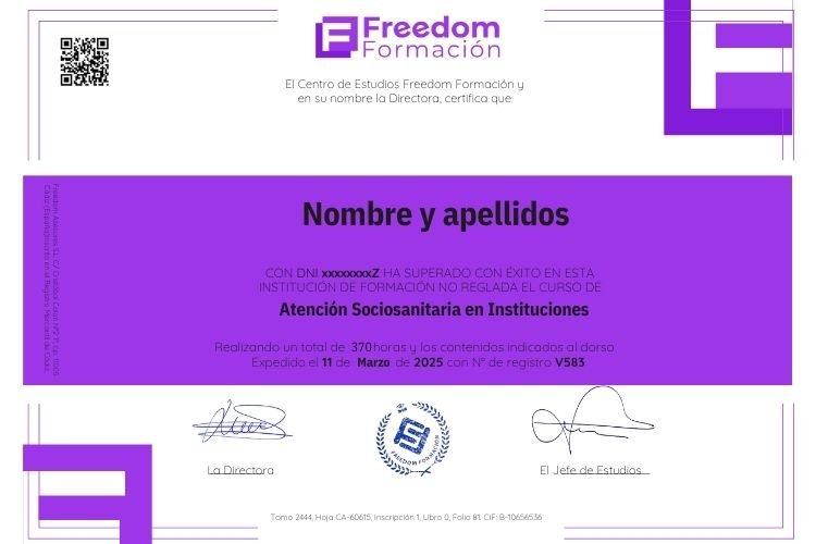 TITULACIÓN de haber superado la FORMACIÓN NO FORMAL que le Acredita las Unidades de Competencia recogidas en el Certificado de Profesionalidad SSCS0208 Atención Sociosanitaria a Personas Dependientes en Instituciones Sociales regulado en el Real Decreto 1379/2008, de 1 de Agosto, modificado por el Real Decreto 721/2011, de 20 de mayo, el cual toma como referencia la Cualificación Profesional SSC320_2 Atención Sociosanitaria a Personas Dependientes en Instituciones (RD 1368/2007, de 19 de octubre). De acuerdo a la Instrucción de 22 de marzo de 2022, por la que se determinan los criterios de admisión de la formación aportada por las personas solicitantes de participación en el procedimiento de evaluación y acreditación de competencias profesionales adquiridas a través de la experiencia laboral o vías no formales de formación. FREEDOM FORMACIÓN es una entidad participante del fichero de entidades del Sepe, Ministerio de Trabajo y Economía Social.